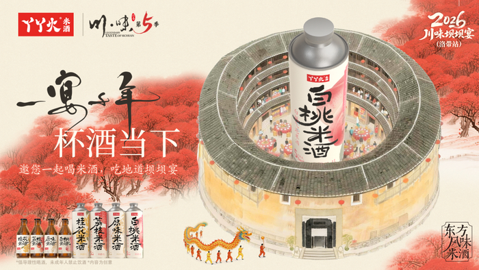 1月30日,由丫丫火米酒,聯(lián)合央視熱播《川味》紀(jì)錄片團(tuán)隊(duì)共同舉辦的川味壩壩宴,在成都洛帶古鎮(zhèn)客家土樓中舉辦,將非遺宴席搬進(jìn)現(xiàn)實(shí),以川味與客家家庭文化的交融為核心,一場(chǎng)500人圍坐的川味非遺壩壩宴正熱鬧開席。席間,幾乎每張桌上都擺放著同一款飲品——丫丫火米酒。